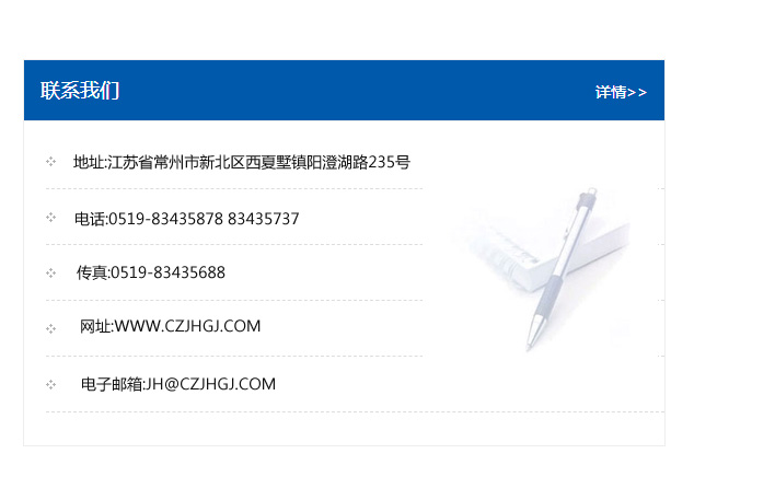 傳真:0519-83435688    郵編:213135    網址:WWW.czjhgj_com.zseastech.com    電子郵箱:JH@czjhgj_com.zseastech.com